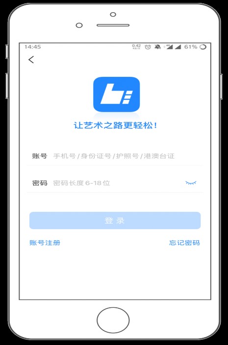 考生打开艺术升APP进入登录页面,输入账号、密码登录。账号一般为考生身份证号或手机号,如果密码遗失,可通过“忘记密码”找回。