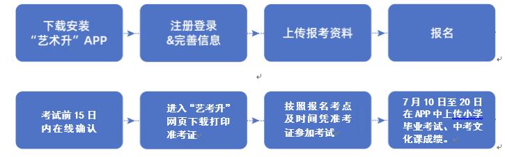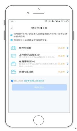 在线确认报名的考生必须在“艺术升”报名系统完成报考资料上传,具体采集信息包括:报名时先上传拍摄免冠一寸照、上传身份证(正面)和户口簿(本人页和户主页),拍摄5秒语音视频。待考生获取所在初中、高中毕业证后,三年制考生上传初中毕业证,六年制考生上传小学毕业证、