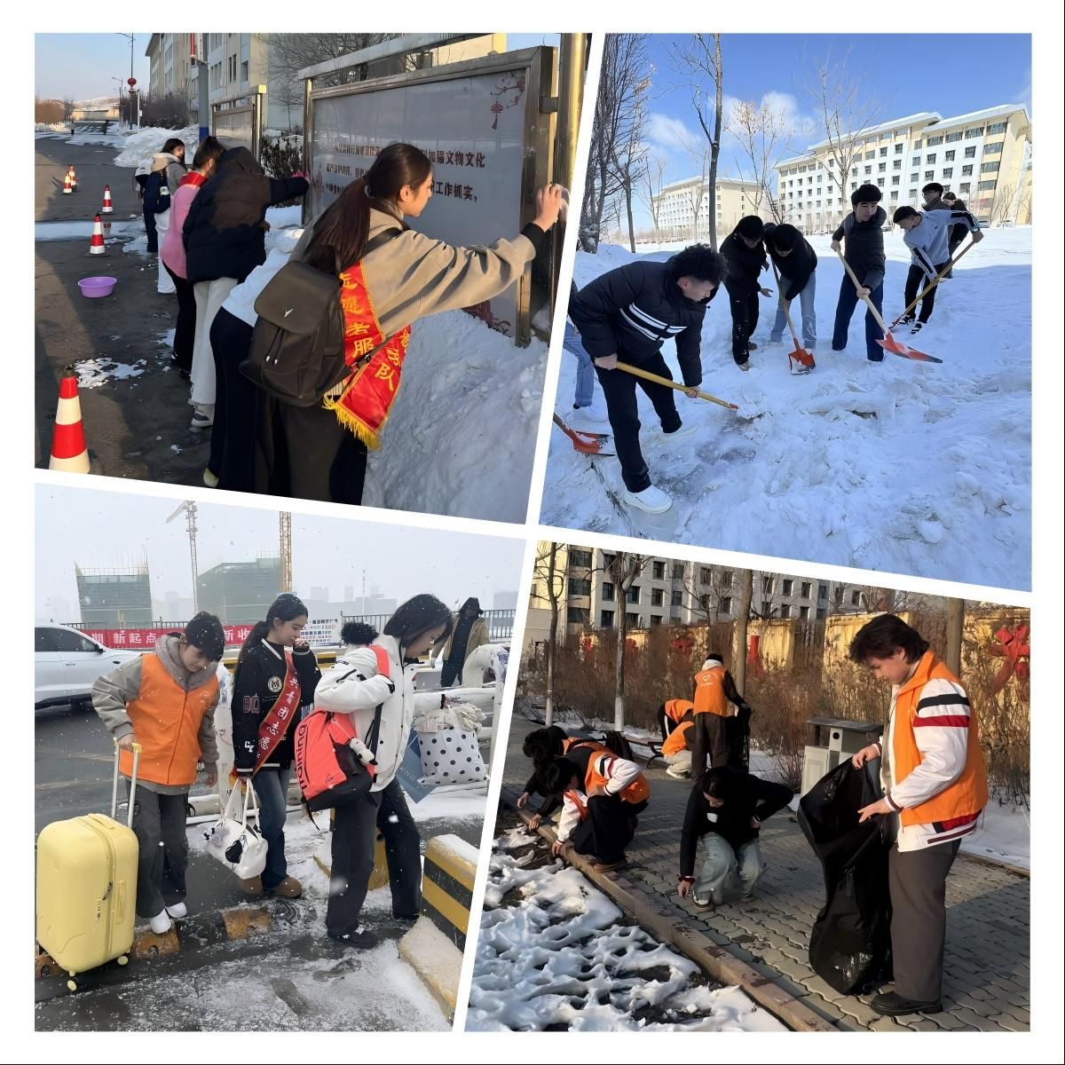 扫雪除冰护平安。 春雪不期而至,给师生出行带来不便。停雪即是命令,志愿者们迅速集结,奔赴校园主干道和活动区域。凛冽寒风中,他们挥动铁锹、推扫积雪,齐心协力、配合默契。经过奋战,一条条“平安路”“温暖路”被清理出来,确保了师生出行安全。汗水融化了冰雪,行动守护了校园安宁。