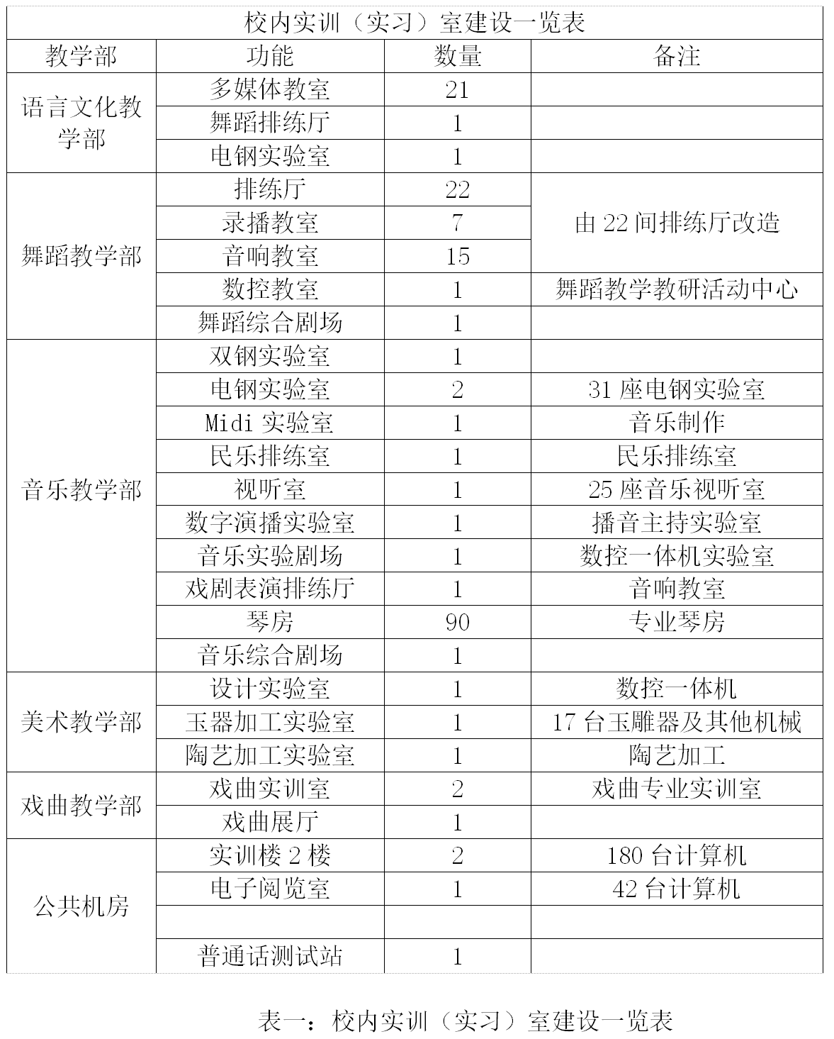 实训设备工位具体配备为:语言文化教学部——学前教育专业音乐教育专业有电钢室1间,工位数为30位。舞蹈实训室1间,工位数为60位;舞蹈教学部——舞蹈表演专业排练厅22间,每间教室占地150平方米、工位数为25位,总工位数为550位;音乐教学部——音乐专业琴房90间,每间工位数为1位,总工位数为90位。民乐团实训室1间,工位数为50位。电钢室2间,工位数60位。钢琴实训室1间,工位数2位。播音主持专业有模拟演播室1间,工位数为15位。视听室1间,工位是为25位。化妆实训室1间、影棚1间、MIDI室1间,每间工位数为10位。后期制作室1间,工位数为12位。戏剧表演实训室1间工位数为25位;美术教学部——专业自然光画室9间,每间画室25人,工位数为25位。玉器加工实训室1间,工位数16位。陶器实训室1间,工位数为16位。公共计算机机房共3间,拥有计算机240台,工位数生均比为7:1。2019年新建音乐器乐实践教学实训室一间,工位数60位;影视实训基地,工位数60位;艺术设计实训基地,工位数60位;音乐综合剧场1个,工位数200位;