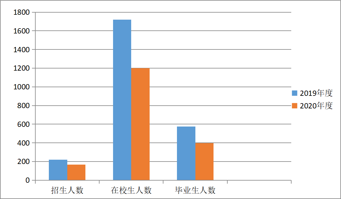 图二:2019、2020学年招生人数、在校生人数、毕业生人数对比