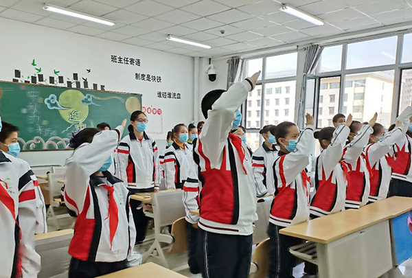 加强校园疫情防控管理。学生实行错时错峰吃饭、上下课,隔位就坐。尤其是培养学生个人防护意识,每周对学生进行科学戴口罩、测体温、常消杀、勤洗手、常通风、保持一米距离的疫情防控教育;配合医院做到全校1300余名师生的核酸检测全覆盖、无遗漏。督促各教学部建立“一班一策”、以班级为单位的疫情防控台账(体温登记、消杀等),确保疫情防控工作不松懈。为我校目前校园内零疫情奠定了坚实的基础。